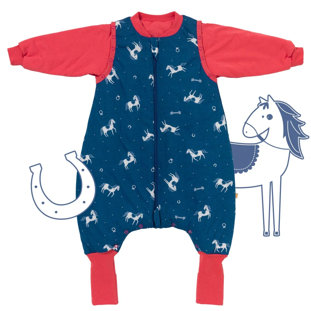Tento protisklzový spací vak s voľnými nohami a s odopínateľnými rukávmi „DUPAČKY“ s motívom Koníci je vyrobený zo 100% BAVLNY .